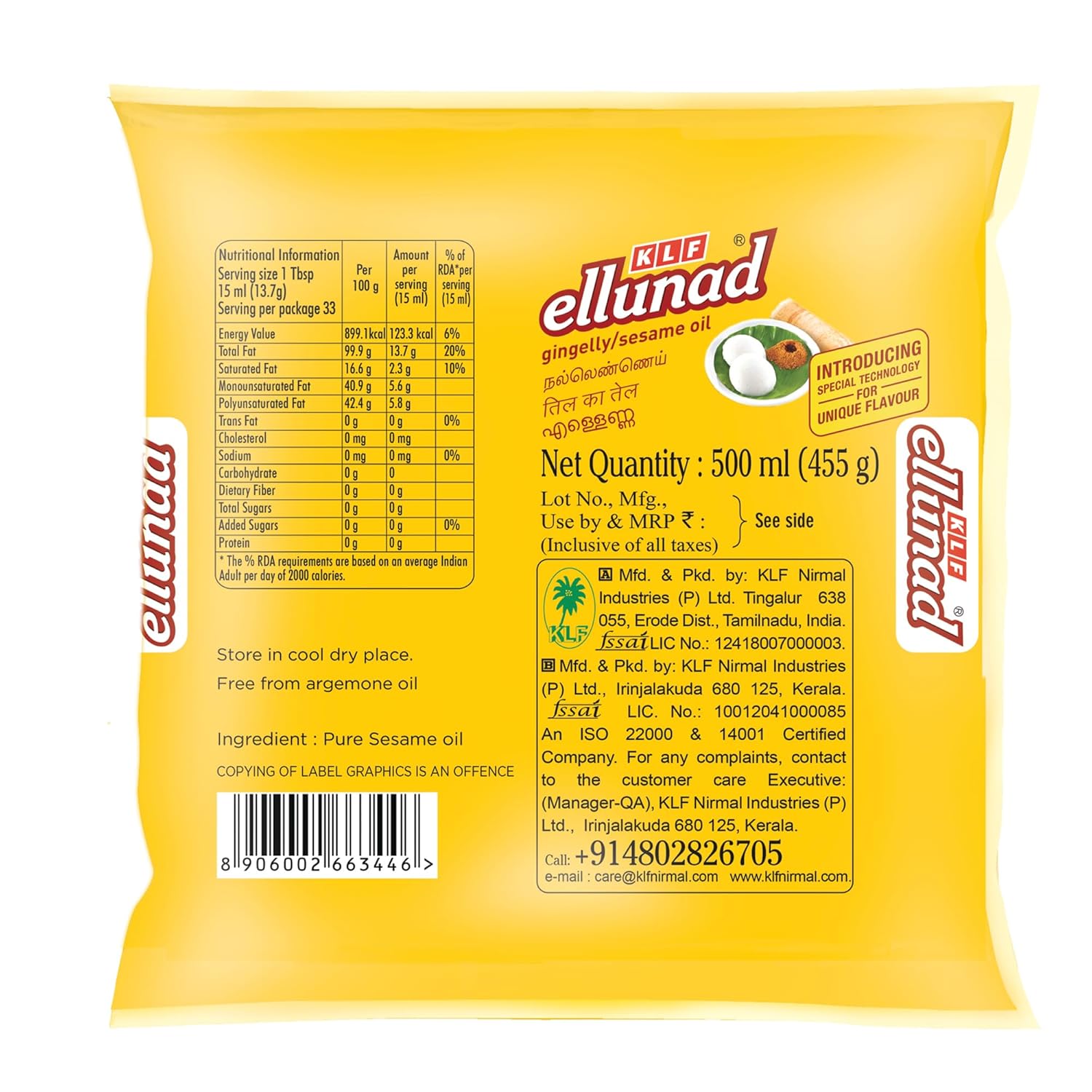 KLF Ellunad sesame is a first of its kind sesame oil, it is processed with a superior crushing technology. The traditional method uses expeller machines for crushing. KLF ensures sesame seeds are crushed at a fraction of time compared to traditional process the resultant oil will have retained its pungency, it will have better aroma, color and texture compared to expeller pressed sesame oil which will have a charred or burnt aroma. Feel the authentic taste of superior sesame oil seeds a must have epically for Tamil Cuisines.