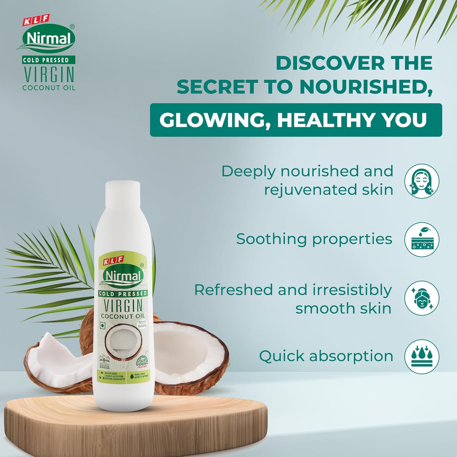 With the ever-increasingly busy lifestyle, our health & well-being tends to take a backseat. In such a scenario, it becomes very important to make healthier choices in every aspect – be it in what we consume or choose to apply on our skin & hair. There are many products that promise almost magical benefits in a short time. But the chemicals in them can have long-term harmful implications for your body. Wellness is not a sprint but a marathon. It comes gradually by adopting healthier habits & natural alternatives that are easy on your body. One such gift of nature is coconut oil. It is one of the healthiest food on the planet. Given the nutrition and benefits that it provides, coconut oil is rightfully called a “Natural Superfood”. With applications ranging from consumption, application and massaging; coconut oil keeps you healthy inside out. Made from fresh coconuts and handled through minimum processing, KLF Nirmal VCO preserves all the natural goodness of coconut in its purest form.