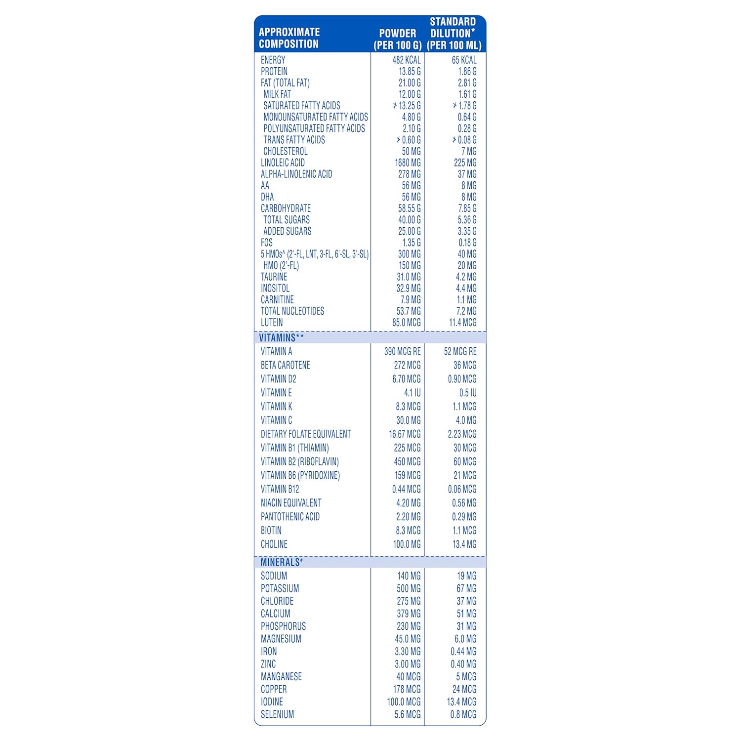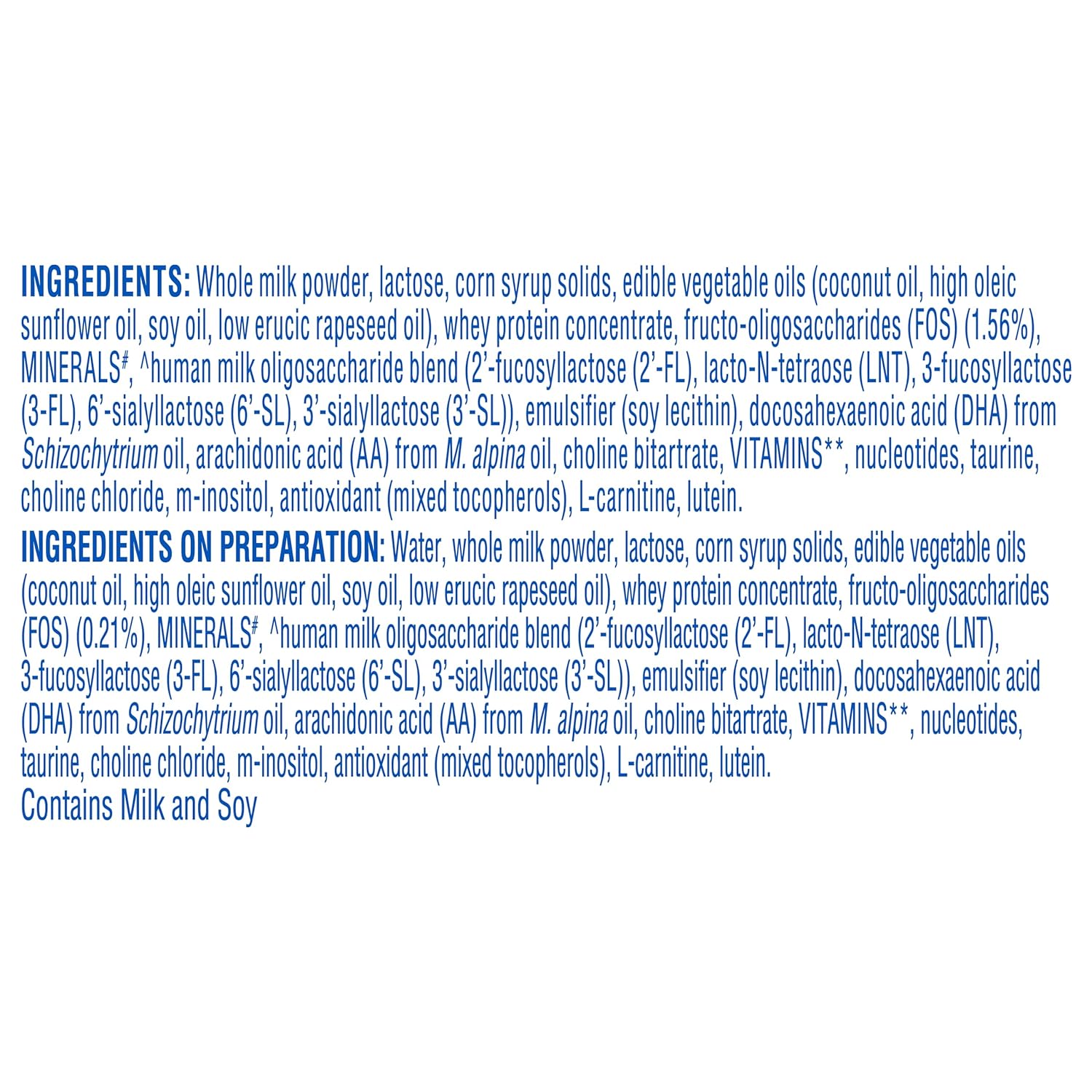 Whole milk powder, lactose, corn syrup solids, edible vegetable oils (coconut oil, high oleic sunflower oil, soy oil, low erucic rapeseed oil), whey protein concentrate, fructo-oligosaccharides (FOS) (1.56%) MINERALS, human milk oligosaccharide blend (2-fucosyllactose (2′-FL), lacto-N-tetraose (LNT), 3-fucosyllactose 3-FL), 6′-sialyllactose (6′-SL), 3′-sialyllactose (3′-SL)), emulsifier (soy lecithin), docosahexaenoic acid (DHA) from Schizochytrium oil, arachidonic acid (AA) from M. alpina oil, choline bitartrate, VITAMINS, nucleotides, taurine, choline chloride, m-inositol, antioxidant (mixed tocopherols), L-carnitine, lutein