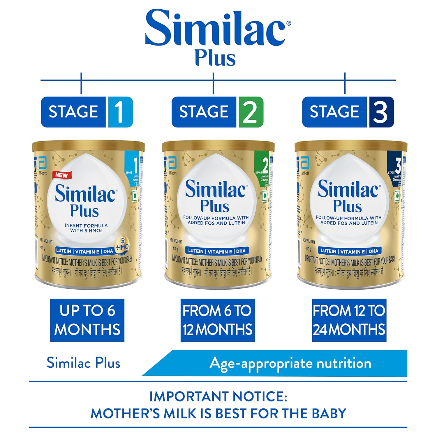 Similac Plus stage 1 is a spray dried infant milk substitute for infants up to 6 months designed to support appropriate growth and development. Similac Plus contains dual immune blend of nutrients like HMO and Nucleotides at TPAN level to support immune system development. It also contains a blend of DHA, Lutein and Natural Vit E that supports brain and eye development. Similac Plus contains HMO that reduces chances of infections, Nucleotides at TPAN level , promoting a lower diarrhea and higher response to vaccination. DHA that promotes development of cognitive functions Lutein, speeds up brain processing , Natural Vitamin E that protects DHA from oxidation