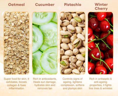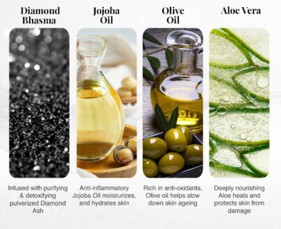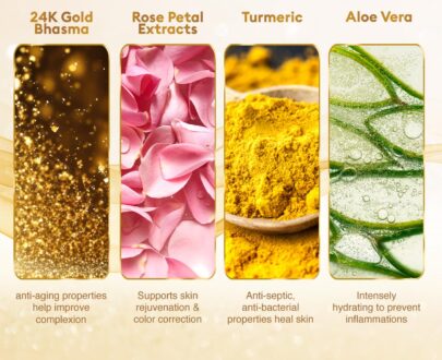 Pearl: Strengthens and improves metabolism of the skin. Aloe Vera: Has anti-allergic, anti-inflammatory, hydrating, healing and rejuvenating properties. Sandalwood: Helps remove tan, brightens the skin and reduces fine lines. Turmeric: Keeps skin infections at bay.